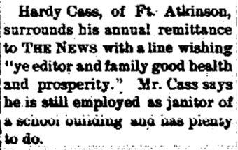 Here is the death notice from the June 13, 1905 edition of the Janesville Gazette for my 3rd great grandfather, Dudley Cass.